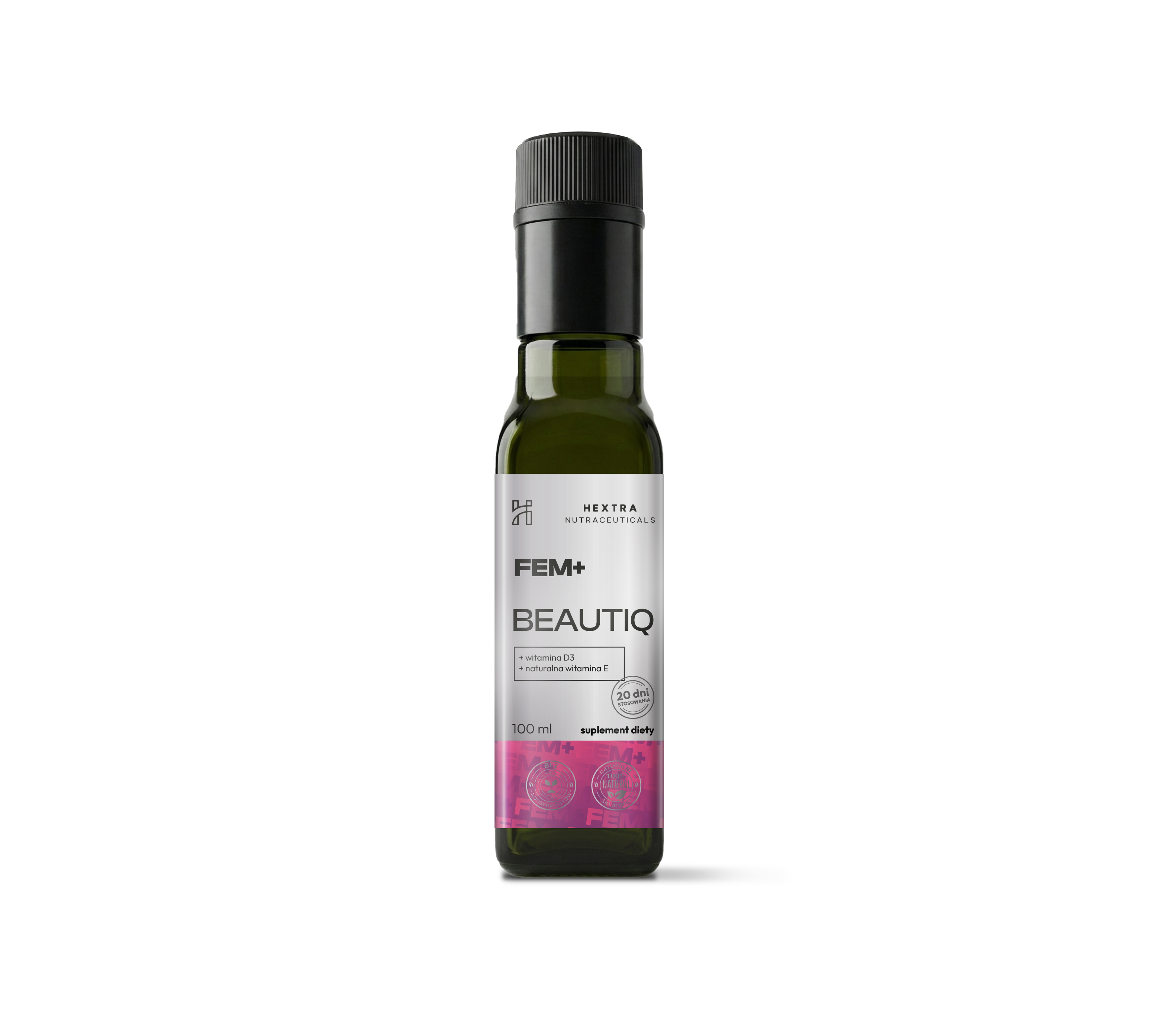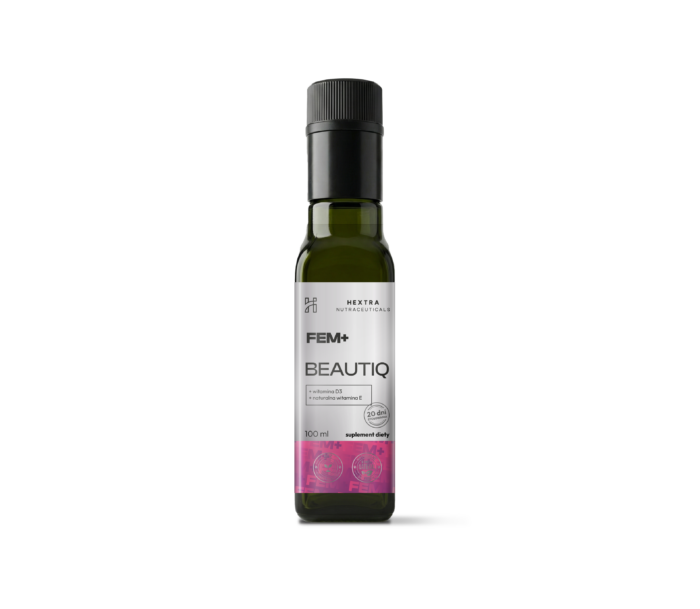 Produkt przeznaczony dla osób dbających o kondycję skóry, włosów i paznokci. FEM+ BEAUTIQ to suplement diety w formie mieszanki olejów roślinnych oraz witamin.