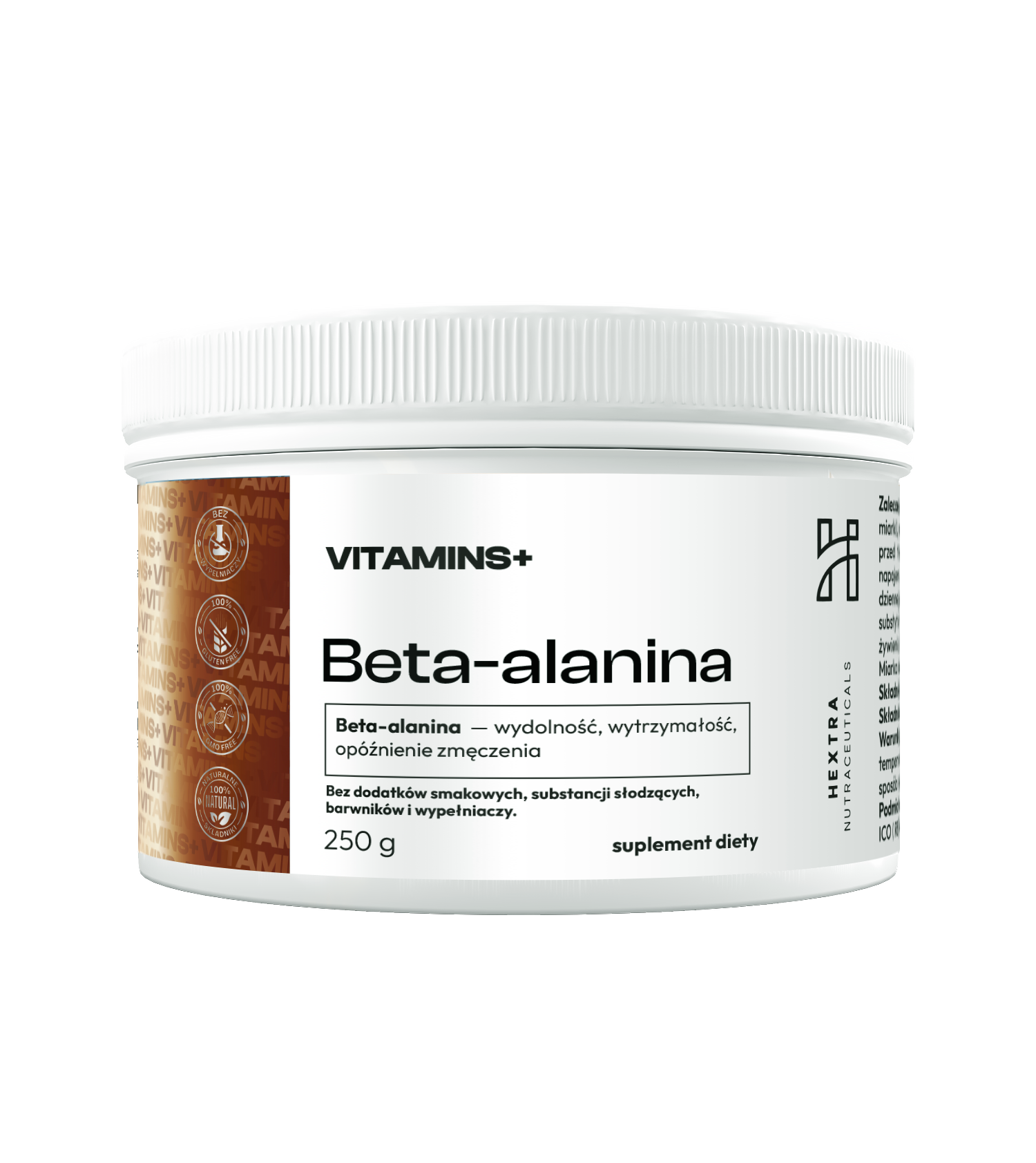 Składniki: beta‑alanina 100%. Bez dodatków smakowych, substancji słodzących, barwników i wypełniaczy.