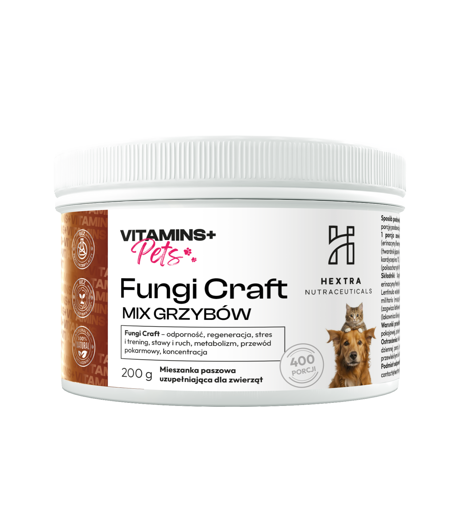 Mieszanka paszowa uzupełniająca dla psów, kotów i małych ssaków, oparta na ekstraktach z 6 grzybów funkcjonalnych: Hericium, Trametes versicolor, Shiitake, Cordyceps militaris, Maitake i Reishi. Naturalne wsparcie odporności, regeneracji, metabolizmu, przewodu pokarmowego, układu nerwowego i ogólnej kondycji zwierząt. Opakowanie 200 g, około 400 porcji (1 porcja = 500 mg, płaska łyżeczka), bez konserwantów i przeciwzbrylaczy.
