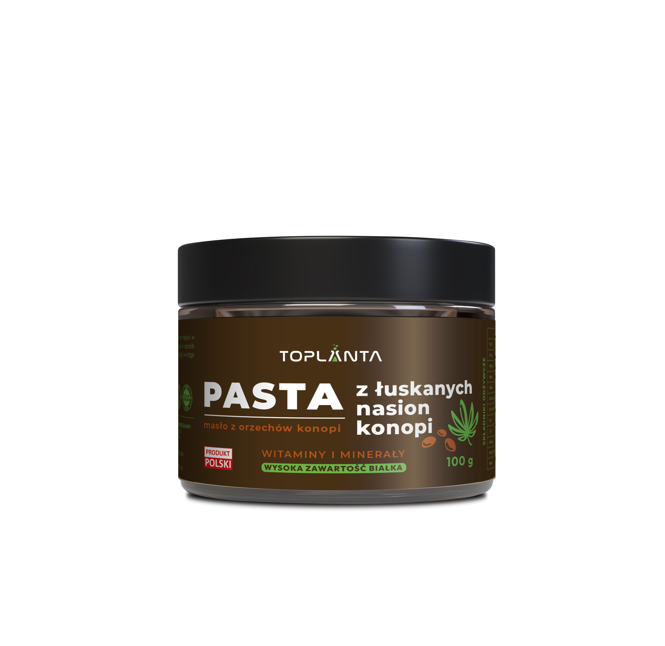 Pasta z łuskanych nasion konopi siewnych to zdrowa alternatywa dla past z orzechów arachidowych, bogata w wysokiej jakości białko roślinne (42,41%), dostarcza niezbędne kwasy tłuszczowe omega-3, omega-6 i omega-9, a także szeroki wachlarz witamin i minerałów w naturalnej, łatwo przyswajalnej formie, dzięki wcześniejszemu usunięciu łupiny produkt pozbawiony jest gorzkiego smaku.