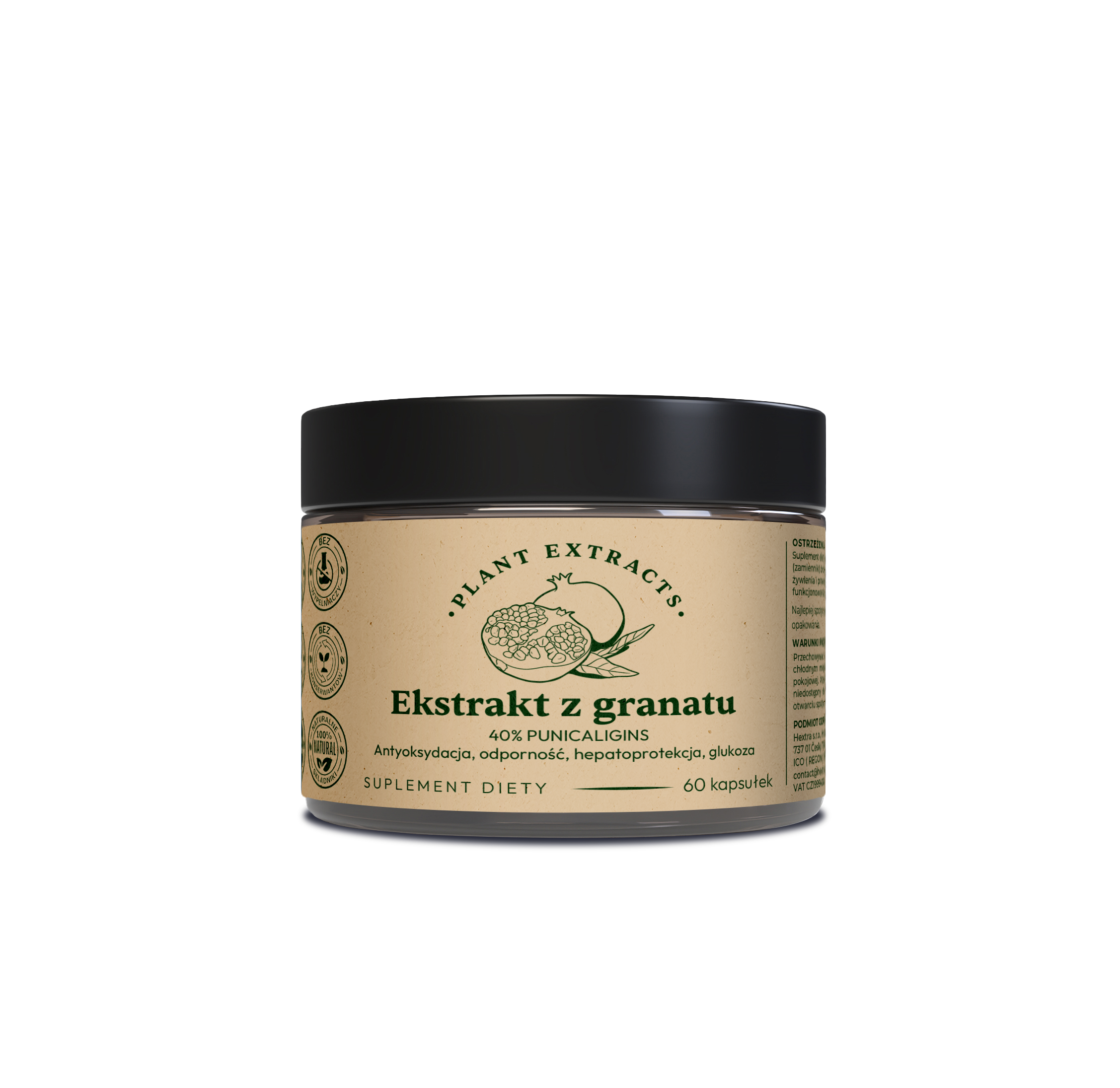 TAGI: granat, punicalaginy, antyoksydacja, odporność, wątroba, metabolizm glukozy, ekstrakt roślinny, suplement diety, kapsułki, PLANT EXTRACTS.