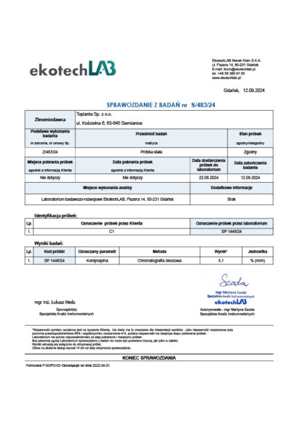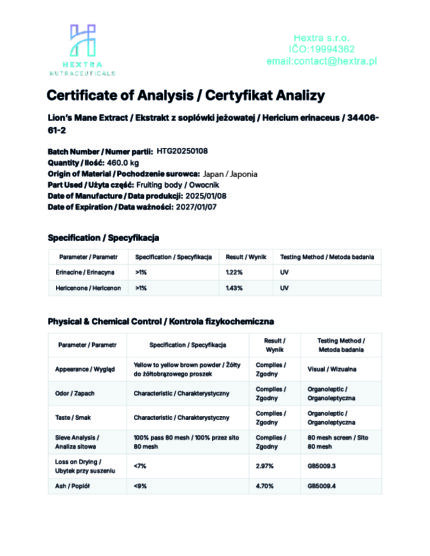 • Ilość składników w 1 porcji dziennej (3 kapsułki): 1500 mg ekstraktu z Hericium erinaceus, standaryzowanego na 2% zawartości hericenonów i erinacyny (30 mg łącznie)