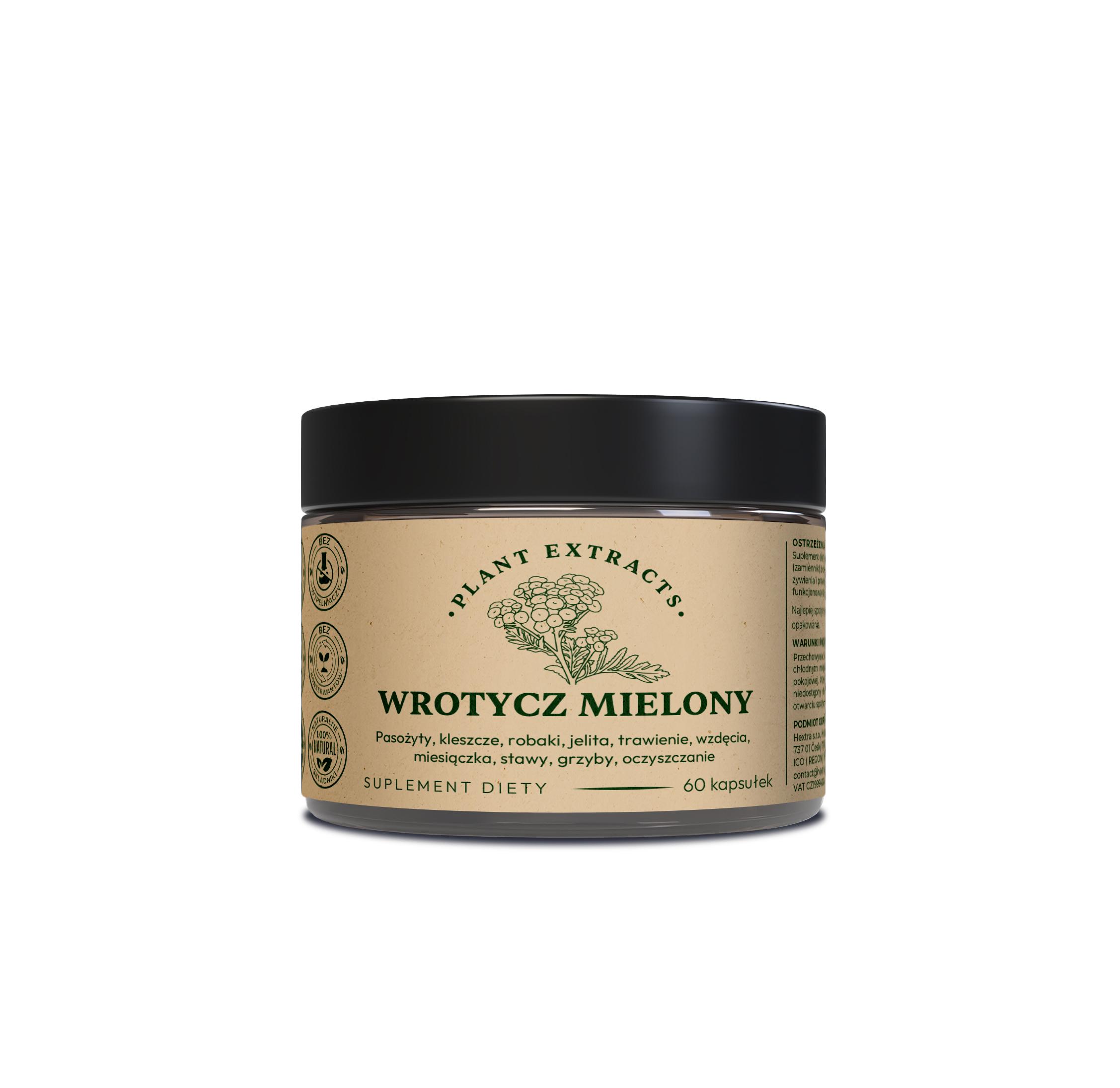 Wrotycz mielony (Tanacetum vulgare L., kwiaty) tradycyjnie stosuje się jako zioło wspierające pracę jelit i trawienie, szczególnie w kuracjach oczyszczających przewód pokarmowy, przy wzdęciach, nadmiernej fermentacji, gazach oraz w kontekście pasożytów i grzybów. W fitoterapii bywa również łączony z dolegliwościami miesiączkowymi, stawowymi oraz jako roślina pomocnicza w mieszankach „na oczyszczanie”. Kapsułkowa forma pozwala stosować wrotycz bez charakterystycznego, intensywnego smaku naparów.